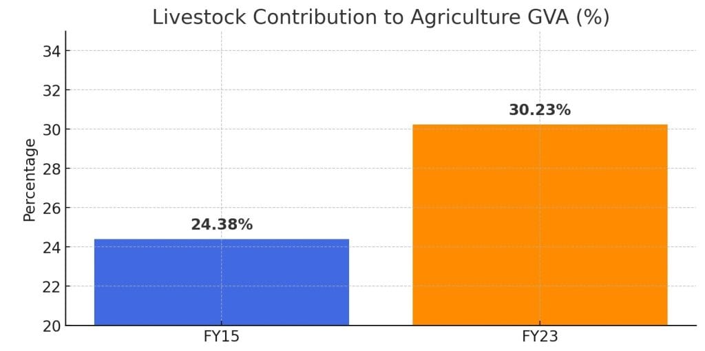 - The livestock sector now accounts for 30.23% of the Gross Value Added (GVA) in agriculture, up from 24.38% in FY15.