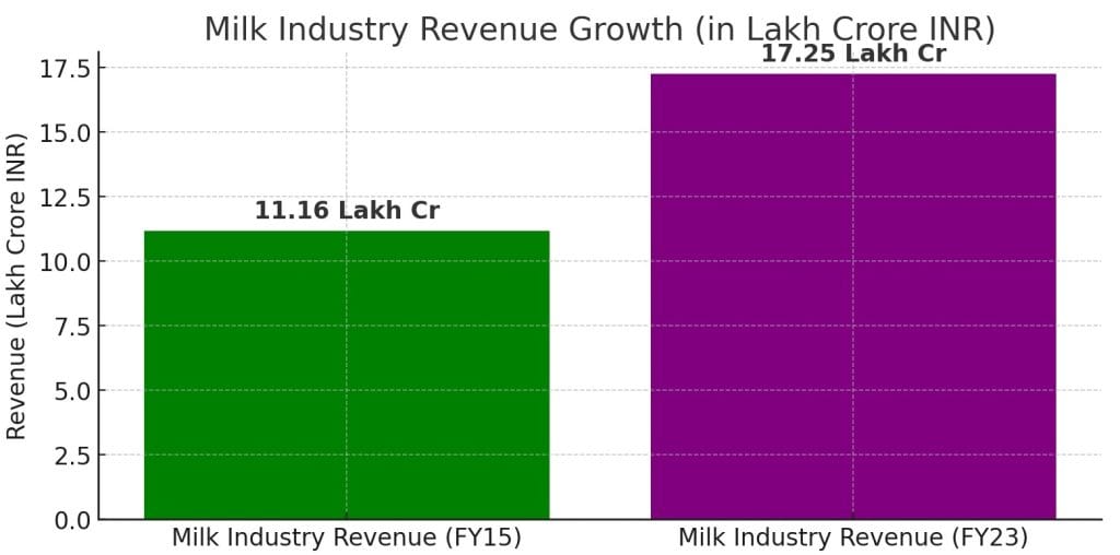 - The dairy industry alone contributed ₹11.16 lakh crore (US$133.16 billion) in FY23, surpassing the combined output value of staple crops like wheat and rice.